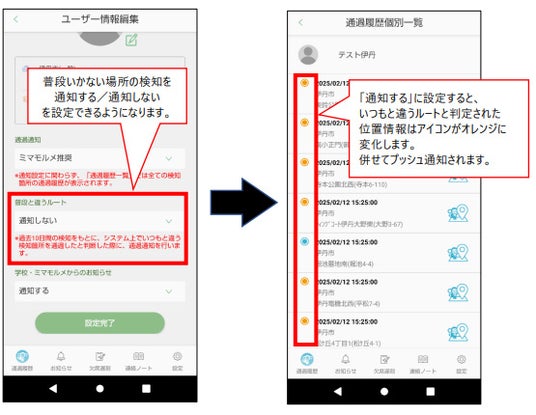 新機能では、普段行かない場所の受信器で子どもや高齢者が持つビーコンの発信器(タグ)を検知した際に、保護者やご家族のスマートフォンアプリへアラート通知を行います。プッシュ通知に加え、通過履歴個別一覧のアイコンの色(通常「ブルー」、アラート「オレンジ」)を変えて表示することにより、子どもや高齢者がいつもと違う行動をとった際に、いち早く気づくことができ、捜索など早期の対応が可能となります。