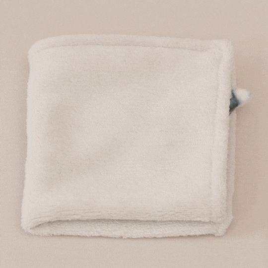 ふわふわな手ざわりのハンカチを毛布に見立てて、日常で見かける“猫あるある”をそのまま再現しています。