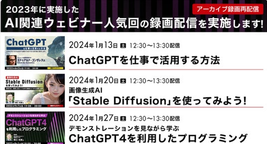 株式会社クリーク・アンド・リバー社(C&R社)は1月13日(土)・20日(土)・27日(土)限定で、2023年に開催したAI関連ウェビナーの中で特に人気のあった「ChatGPTを仕事で活用する方法」(1月13日)、「画像生成AI『Stable Diffusion』を使ってみよう」(1月20日)、「ChatGPT4を利用したプログラミング」(1月27日)のアーカイブ映像をそれぞれ無料配信します。生成AIを仕事で活用したい方や、もう一度見たい、見逃したという方は是非この機会にご視聴ください。