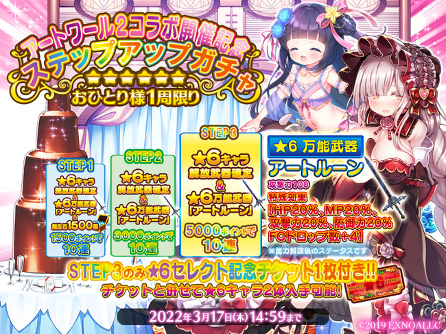 ▼アートワール2コラボ開催記念ステップアップガチャ開催!STEP3で★6キャラ2体確定!