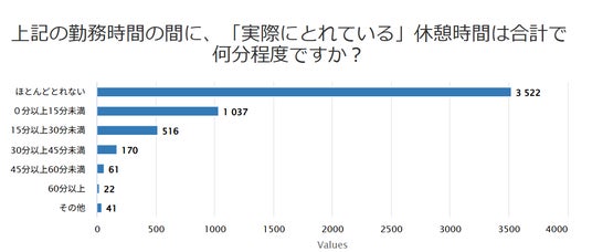 1日に取得できている休憩時間について、「ほとんどとれない」と回答した人は全体の65.6%(3,522人)にのぼりました。これに「15分未満」を加えると、この設問に答えた回答者の85%近くの人がまともな休憩を取れていない実態がわかります。