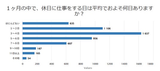 持ち帰り残業も休日勤務も「ほとんどない」と答えたのは401人にとどまり、回答者の少なくとも9割以上が一か月のうちに持ち帰り残業か休日勤務、あるいはその両方をしていると考えられます。