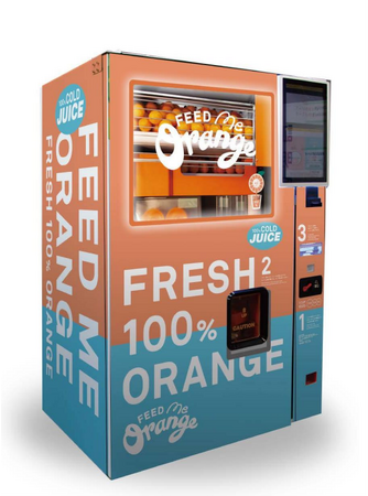 欧米や東南アジアなどで広くサービスが展開され、2021年7月の日本初上陸以来、老若男女問わず幅広い層から人気を集めている生搾りオレンジジュース自動販売機。贅沢にも1杯に3~4個の生のオレンジを使用し、マシンが自動でオレンジをカット、プレス、搾汁、カップに注ぎます。約40秒で果汁100%の無添加で香り高い搾りたてオレンジジュースをご提供します。