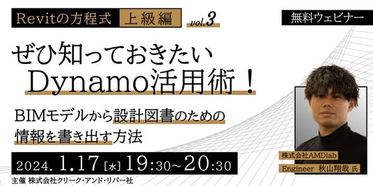 株式会社クリーク・アンド・リバー社(C&R社)は1月17日(水)、BIMソフトウェア「Revit」の中級者から上級者の方々を対象とした無料のオンラインセミナー「【Revitの方程式・上級編vol.3】ぜひ知っておきたいDynamo活用術! BIMモデルから設計図書のための情報を書き出す方法」を開催します。