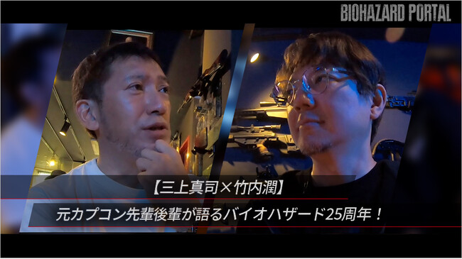 今回の動画では25周年を迎える「バイオハザード」ブランドを記念して、ブランドを統括する竹内潤が、1996年に発売された第1作「バイオハザード」のディレクターである三上真司氏をゲストにお迎えします。