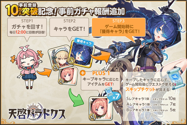 ▼事前登録ガチャでキープキャラのレアリティに応じてスキップチケットをプレゼント!