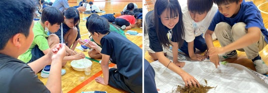 オリエンテーションでしっかりと学んだら、いよいよ海藻の卵採取に取り掛かります。まずは海藻の特徴を観察して絵を描き、気づいたことをワークシートに書き込みました。その後、卵がついた生殖器床をハサミで切り取り、ネットを張って海水を入れたお皿に置いていきます。初めての作業に子ども達は興味深々。楽しそうに作業を進めていました。卵が生殖器床からネットの下に落ちるまで時間がかかるので、1日目はこれで終了です。