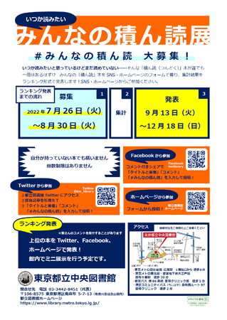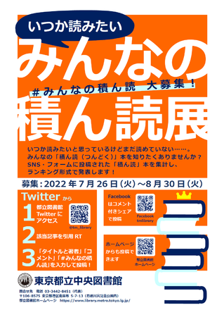 東京都立中央図書館では、「いつか読みたいみんなの積ん読展」を実施します。
