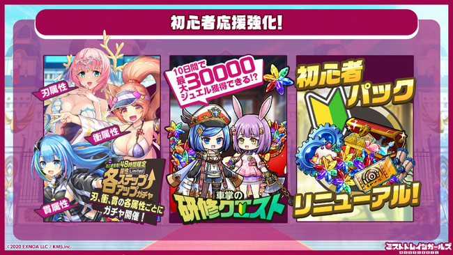 3月16日(水)以降に新しくミストトレインガールズを始めた方に対して、3つの初心者応援強化イベントです。48時間限定各属性Limitedステップアップガチャ、車掌の研修クエストが開催され、リニューアルされた初心者パックを購入できます。