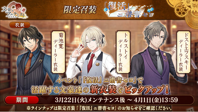 さらに、イベントと同時に開催される限定召装『「復活」ニ潜書セヨ』にて新規追加された「トルストイ」「ドストエフスキー」「菊池寛」の〈ディーラー衣装〉を編成すると、得点の獲得率がそれぞれ30%上昇します。