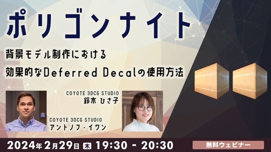 株式会社クリーク・アンド・リバー社(C&R社)は2月29日(木)、3DCGデザイナーや3Dモデリング、3Dモーション、アニメーション、テクニカルアーティストなどゲーム開発に携わる方を対象に、無料のオンラインセミナー「ポリゴンナイト 背景モデル制作における効果的なDeferred Decalの使用方法」を開催します。▼詳細・お申し込みはこちら