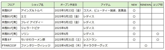 リニューアル第一弾となる今春は、7区画約1,000平方メートル のリニューアルを実施。本館B1F、B2Fを中心に、レディスファッションやコスメ・ドラッグショップがオープン。全国初出店のレディスファッション「SORIN」や、大人気「ちいかわラーメン豚」がエリア初登場いたします。