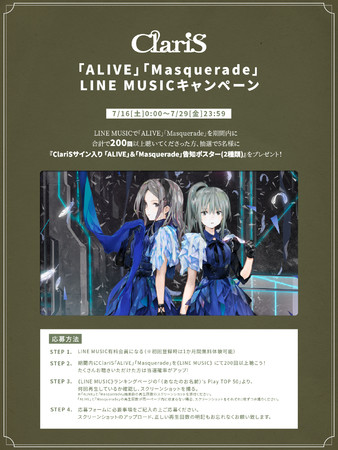 またLINE MUSICでは、新曲「ALIVE」「Masquerade」を期間内に合計で200回再生以上聴いてくださった方に、抽選で5名様に『ClariSサイン入り 「ALIVE」&「Masquerade」告知ポスター(2種類)』をプレゼントといった「LINE MUSICキャンペーン」も開催している。HPにて詳細をチェックいただき、ぜひこちらのキャンペーンにも参加してみてはいかがだろうか?