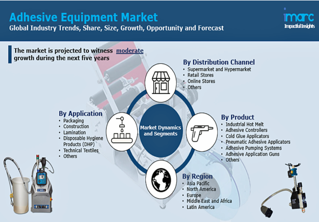 安全性への懸念と利便性の向上により、使い捨て衛生用品(DHP)の需要が大幅に増加していることが、市場の成長を促進する主な要因となっています。接着装置は、より良い品質の製品をより早く、比較的低いコストで提供するために、DHPの製造に広く利用されています。また、材料の迅速かつ安全な接着、生産コストの削減、既存の生産ラインとの互換性などの理由から、世界中の包装産業で接着装置の需要が拡大しています。さらに、食品・飲料、電子機器、医薬品、日用消費財(FMCG)など、さまざまな用途で利用が拡大していることも、市場の成長を促しています。さらに、大手企業は、化石燃料ベースの成分に依存するバイオベースのホットメルト接着剤など、革新的で持続可能な機器の導入に注力しています。これらの接着剤は、優れた性能、容易な変換、および耐熱性を提供し、これが市場の成長を押し上げています。その他、工業化の進展、包装分野の支援策として各国政府により実施されている有利な取り組み、既存インフラの改修・改装のための建設支出の増加、自動車および家電産業の隆盛などが、市場の成長をさらに加速すると予測されています。