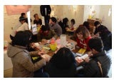 アーティスト、高橋匡太(※1)と一緒に、果実袋に「笑顔」を描くワークショップ。