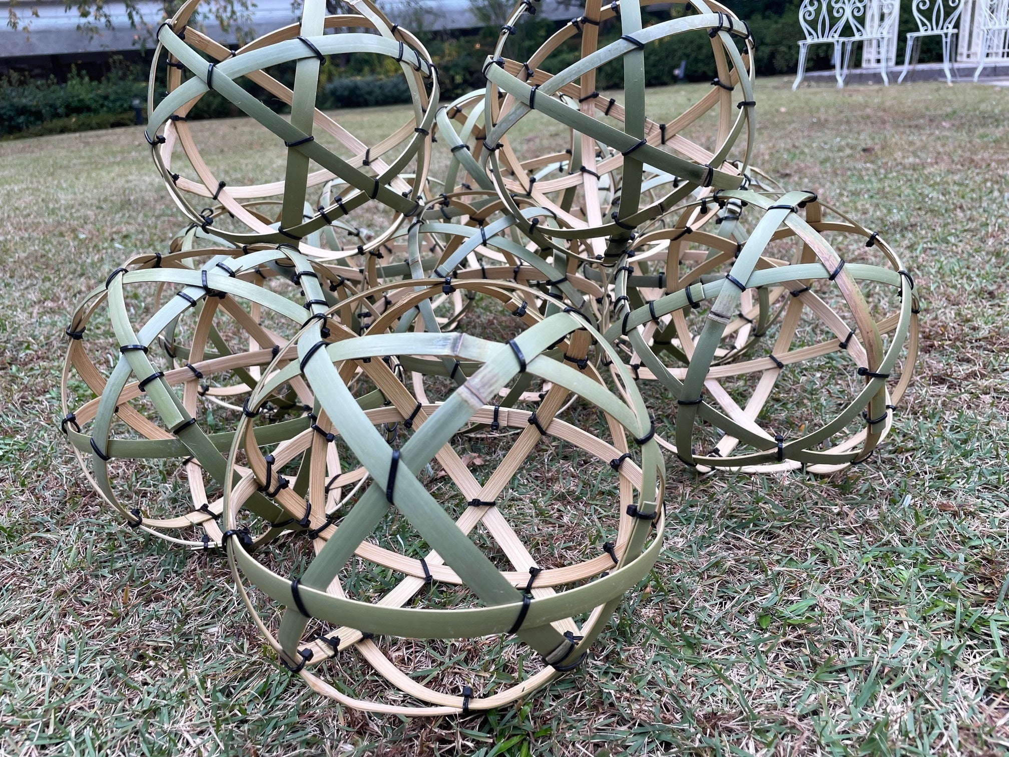 工房で竹の輪を組み合わせながら、効率的な組み方を模索していると、五角形と三角形からなる幾何学的な法則を見つけました。それを組み立てていると通りがかったイタリア人が「何を作ってるの?それはジェネサ(Genesa)よ!」と興奮した声で話しかけてきました。彼女は、この形が神秘的な力を持っていると話してくれました。この神聖幾何学形にはいくつかのパターンがあるそうで、今回の形は「ペンタスフィア(Pentasphere)」と呼ばれています。これらの神聖幾何学形はヒーリングや浄化、農業などに使われています。