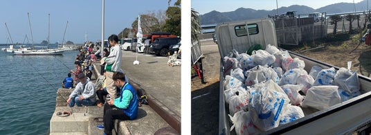漫画の聖地でのイベント開催ということもあり、釣り体験・ごみ拾い活動には熊本県内外から漫画ファンをはじめ事前に約180組の申し込みがありました。釣果はそれぞれでしたが、「コノシロ」「メバル」などが釣り上がる度に、参加者からは歓声が上がりました。また漁港周辺には、ペットボトルやレジ袋、漁具などの海洋ごみが落ちており、最終的には軽トラックの荷台がいっぱいになる量を回収しました。