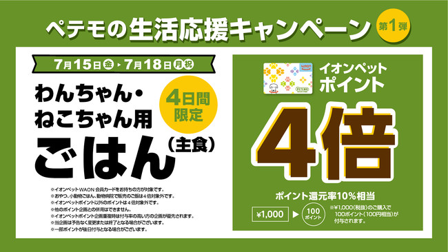 ペットフードのお買上げ時に付与するイオンペットWAONポイントが通常の4倍となり、お買上げ金額の10%相当をポイントで還元します。
