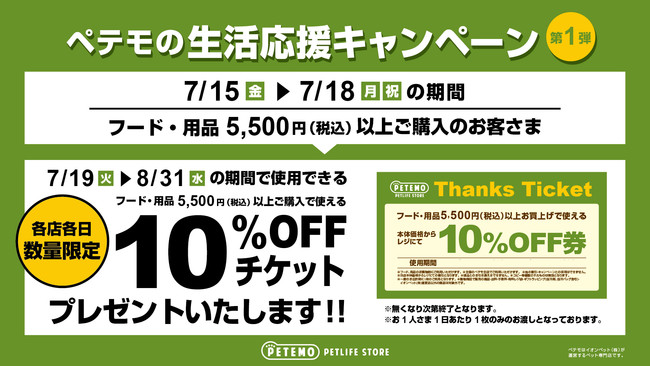 日頃ペテモをご愛顧いただく感謝とともに、お客さまに引き続きペットフードを安心してご購入いただくため、ポイント還元および割引チケットの提供という形で、健康的なペットライフを支えてまいります。