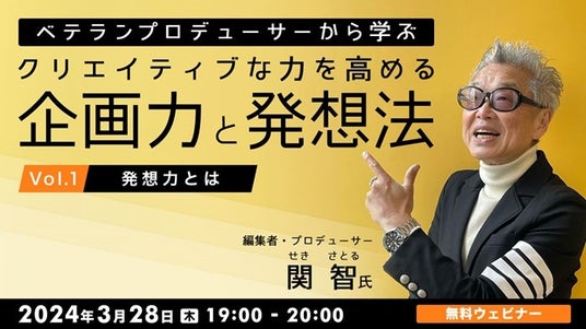 株式会社クリーク・アンド・リバー社(C&R社)は3月28日(木)、クリエイティブディレクターやプロデューサー、広告クリエイター、デザイナーの方などクリエイティブ業界で活動する方などを対象に、無料のオンラインセミナー「ベテランプロデューサーから学ぶ クリエイティブな力を高める企画力と発想法 Vol.1 ~発想力とは~」を開催します。