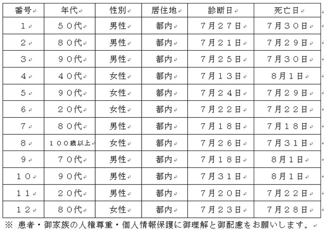 2022-08-04 東京都 新型コロナウイルスに関連した患者の死亡について Tweet ~新型コロナウイルスに関する東京都からのお知らせ~ 都内で新型コロナウイルスに感染した方が死亡されましたのでお知らせします。 お亡くなりになった方のご冥福をお祈り申し上げます。 企業プレスリリース詳細へ PR TIMESトップへ 公式ツイッター Follow @Straightpress 最新情報をTwitterで受け取ろう! 公式フェイスブックページ 最新情報をFacebookで受け取ろう! 前の記事 一覧へ戻る 次の記事