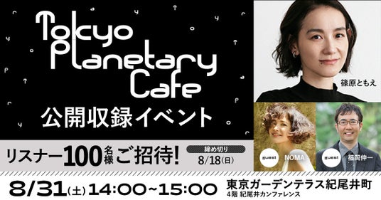 TOKYO FMで放送中の、篠原ともえがパーソナリティをつとめる星空トーク満載の番組『東京プラネタリー☆カフェ』(毎週土曜日20:30~20:55放送)では、2024年8月31日(土)14:00~東京ガーデンテラス紀尾井町4階の紀尾井カンファレンスにて番組の公開収録を行います。ゲストにNOMA(モデル)、福岡伸一(生物学者)を迎え、顕微鏡やルーペで観察したり、ミクロな視点から宇宙を語ってみたり…など盛り沢山なイベントとなっています。この公開収録にリスナー100名様をご招待します。番組サイトからお申し込みください。