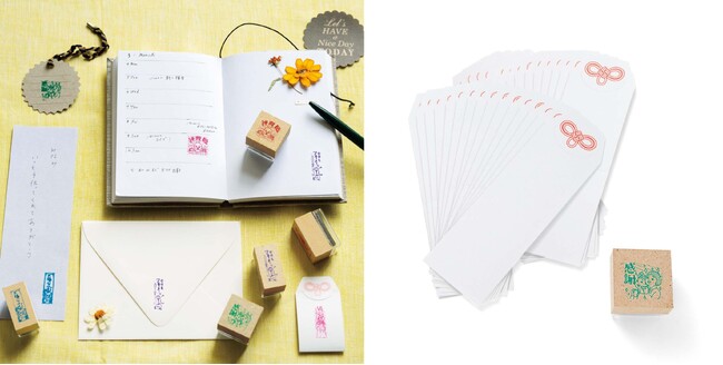 イラストレーター五月女ケイ子さん描き下ろし、インクパッド不要の浸透印タイプのスタンプです。押すだけで繊細な絵柄が表れ、メッセージやスケジュール帳を楽しくアレンジします。デザインは日本の神話『古事記』に登場する神さまのイラストにひとこと添えられたものを、陰陽五行をヒントにした5色で展開しています。押すたびにポジティブな気持ちを後押しします。