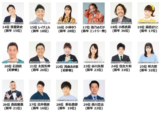 女性座員の活躍も目立つ中、セカンドシアターで活躍中の“小林ゆう”、 “住吉大和”、 “咲方響”など「秘蔵っ子」メンバーら若手座員も台頭し、最年長参戦となる“池乃めだか”、今回初参戦の“石田靖”も堂々のランクイン。
