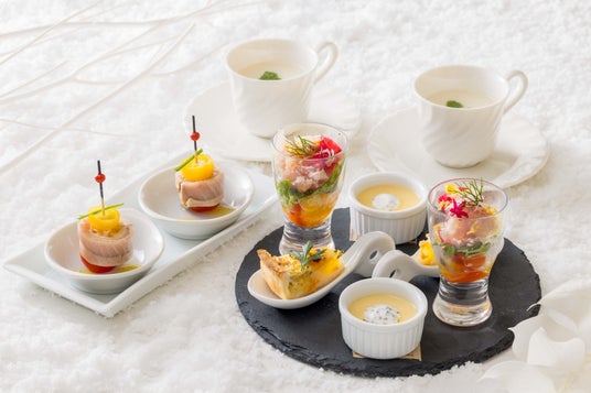 また、クリーミーでカリフラワーの甘みを感じる「カリフラワーのスープ」をはじめ、つるりとした食感も楽しい「蕪のフラン」、さっぱりとしてお口直しにもぴったりな「生ハムと紅芯大根のサラダ仕立て」など、セイボリーも丁寧に仕上げました。