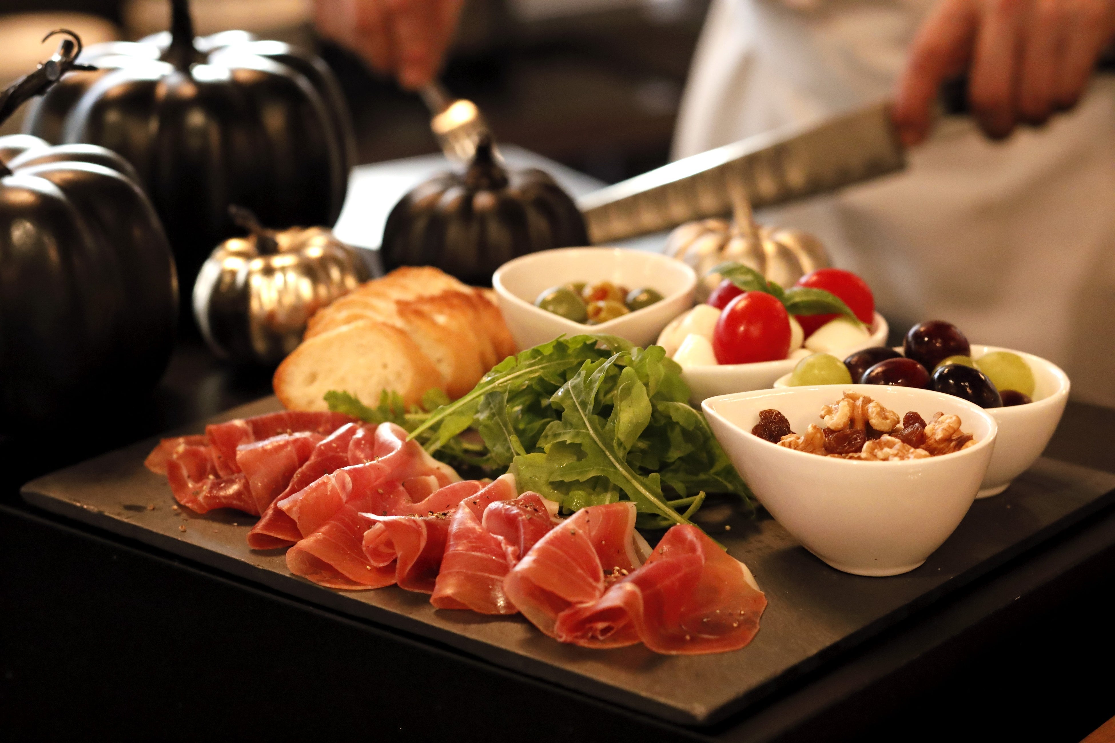 ビュッフェでは、「イベリコ豚」生ハムのカッティングサービスを中心に、タパスやパエリアなど雰囲気に合わせたバルメニューを提供します。