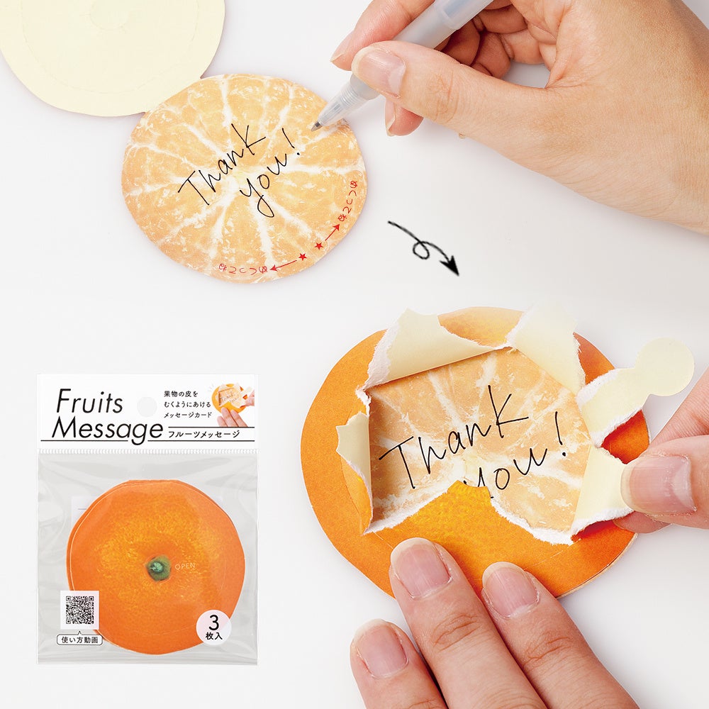 フルーツの皮をむくように開ける新感覚のメッセージカード。メッセージと一緒に開ける楽しみも贈るユニークなカードです。