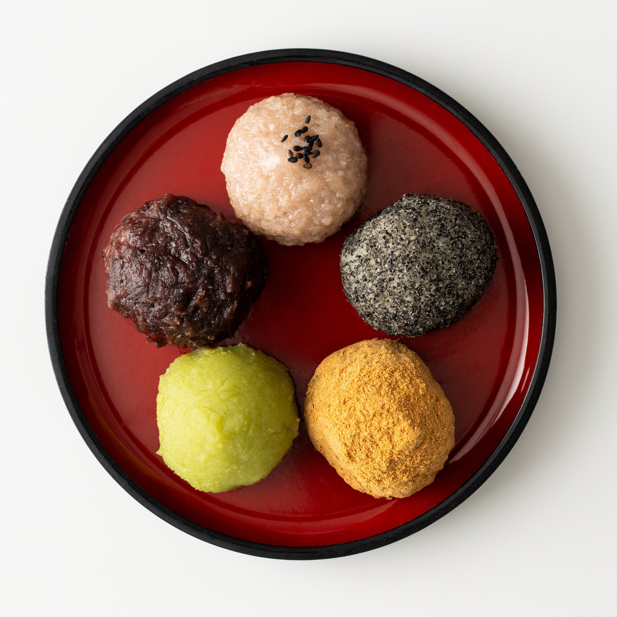 ひと口サイズの「こはぎ」(粒・きなこ・すりごま・赤飯・ずんだ)を5種類詰めた特別セットです。