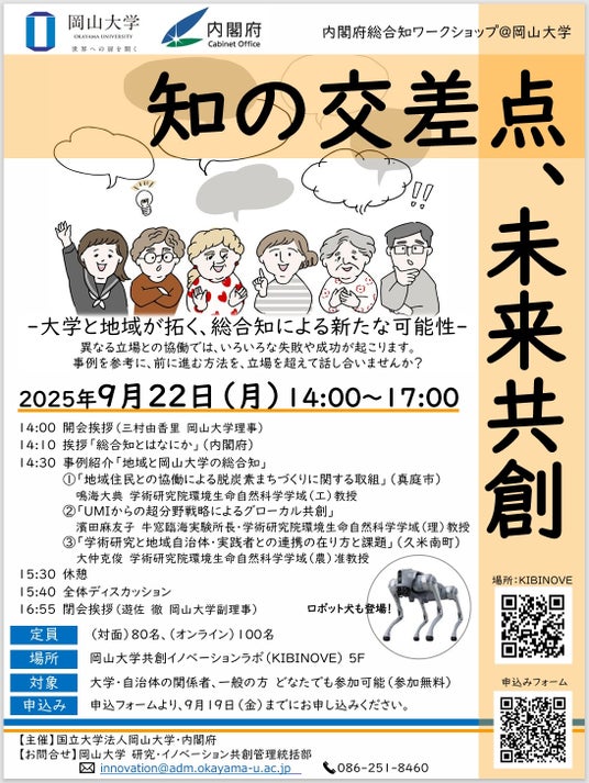 国立大学法人岡山大学(本部:岡山市北区、学長:那須保友)は、内閣府とともに2025年9月22日(月)に「内閣府総合知ワークショップ@岡山大学 知の交差点、未来共創-大学と地域が拓く、総合知による新たな可能性-」を、本学津島キャンパスの共創イノベーションラボ(KIBINOVE:きびのべ)とオンラインでのハイブリッド形式で開催します。