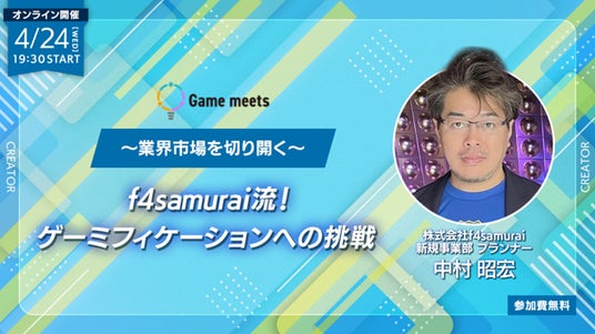 株式会社クリーク・アンド・リバー社(C&R社)が主催するクリエイティブ共創コミュニティ「Game meets」は4月24日(水)、ゲーミフィケーションにご興味をお持ちの方を対象に、無料のオンラインセミナー「f4samurai流!ゲーミフィケーションへの挑戦~業界市場を切り開く~」を開催します。