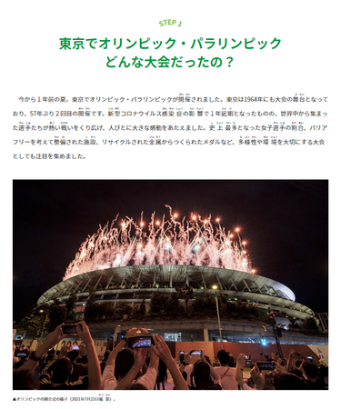 本日より配信開始した8月号では、「東京2020オリンピック・パラリンピックを振り返る~選手・ボランティアの活躍と未来へつなぐレガシー~」と題して、ボランティアの方々の活躍や大会が残したレガシーなどを紹介。東京オリンピック金メダリスト 伊藤美誠選手から子供たちに向けたメッセージも掲載しています。
