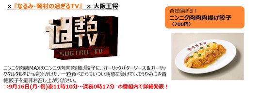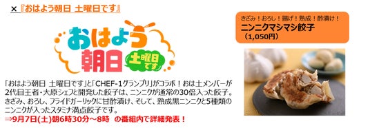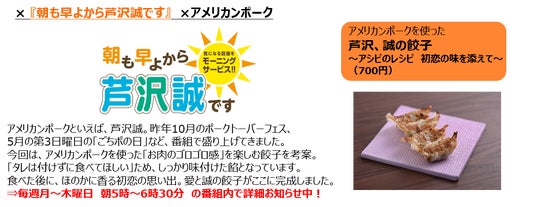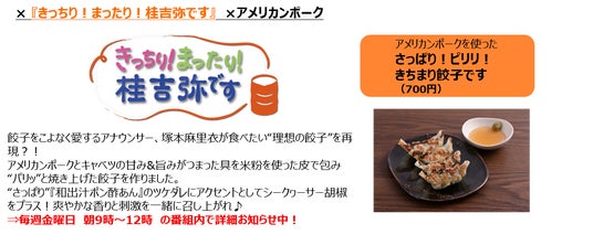 テレビから『おはよう朝日 土曜日です』が『CHEF-1グランプリ』2代目王者・大原シェフと開発した餃子を、『なるみ・岡村の過ぎるTV』は“大阪王将”とのコラボを果たし、ラジオからは朝の名物2番組『朝も早よから芦沢誠です』『きっちり!まったり!桂吉弥です』が、“アメリカンポーク”とコラボした餃子を出店します。