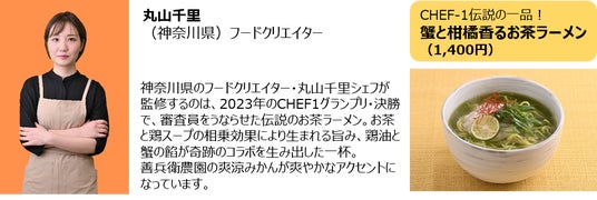 「CHEF-1グランプリ審査員監修スペシャル餃子」餃子メニューのほか、昨年の『CHEF-1グランプリ2023』決勝で審査員をうならせた丸山千里シェフ監修の“伝説のお茶ラーメン”も出店することが決定しました。