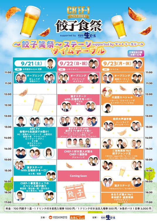 また、フェス中の3日間、会場で芸人が多数出演するステージ「~餃子笑祭~ステージ supported by サントリー生ビール」のタイムテーブルも公開します。