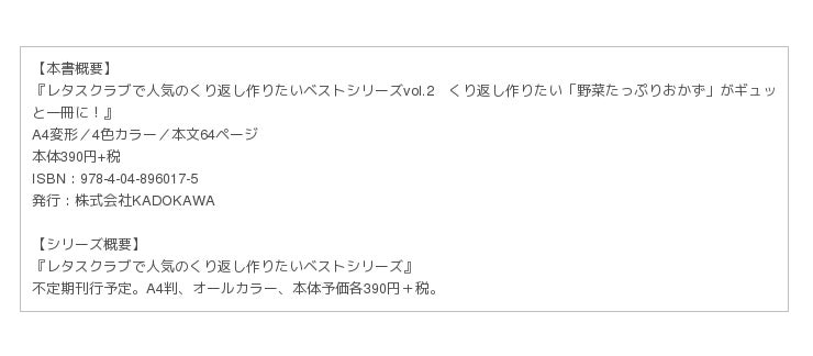 株式会社KADOKAWA(本社:東京都千代田区、代表取締役社長:松原眞樹)より『レタスクラブで人気のくり返し作りたいベストシリーズ』がスタートし、第二弾として『くり返し作りたい「野菜たっぷりおかず」がギュッと一冊に!』を7月6日(木)に発売します。
