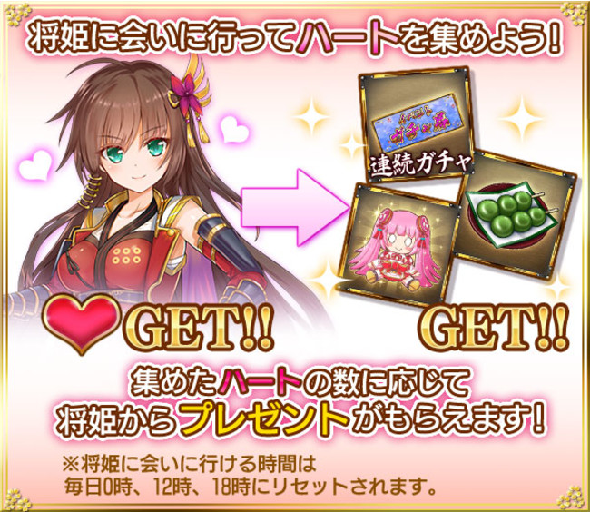 期間中ログインしてお気に入りの将姫に会いに行くと、「ハート」と「キャラからの一言コメント」を毎回もらえます!ハートを集めると数に応じて「11連イベントガチャ券」もらえます♪