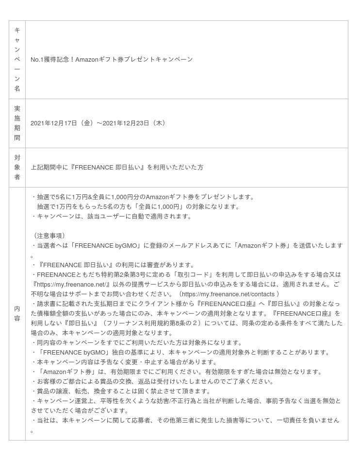 これを記念して、請求書(売掛債権)をすぐに現金化できるファクタリングサービス『FREENANCE 即日払い』を利用いただいた方を対象に、本日2021年12月17日(金)から12月23日(木)までの期間、「No.1獲得5冠」にちなんで抽選で5名に1万円、さらに、全員に1,000円分のAmazonギフト券をプレゼントするキャンペーンを実施します。