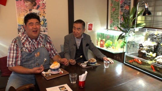 その後は、金魚を眺めながらゆったりとできる珍しいカフェ「きんぎょcafe 柳楽屋・陽だまり」に入店。ここでは、珍しい種類の金魚を観察しながら、人気メニュー「黒蜜きなこのかき氷」に舌鼓を打ちます。