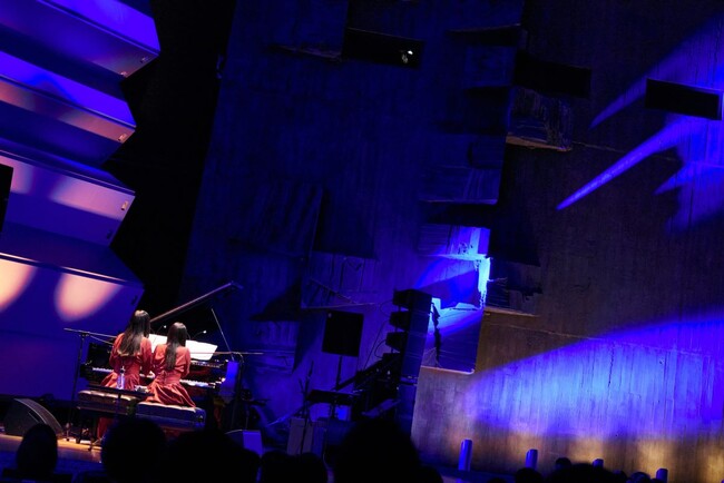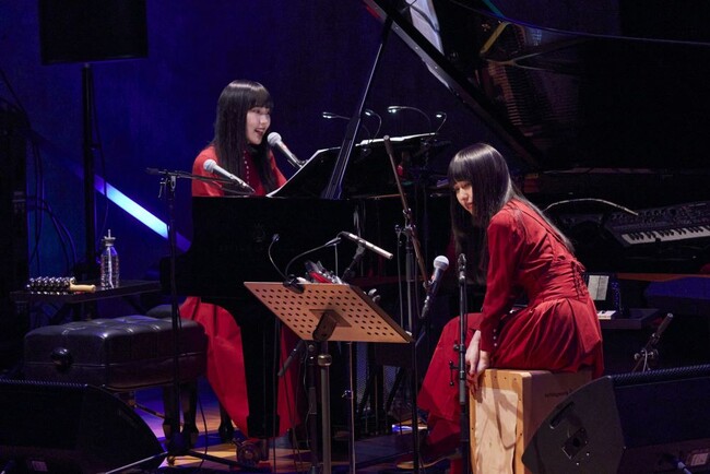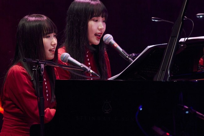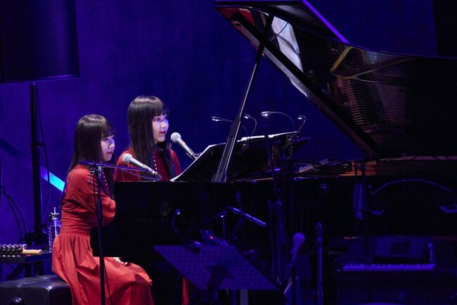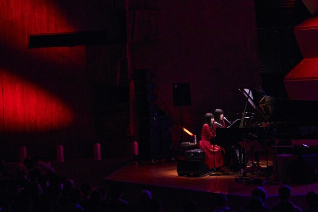 まず、コンサートの1曲目に選ばれたのは「異邦人」(久保田早紀)。拍手に迎えられたMonaとHinaがちょこんとピアノの前に座り、あのメランコリックなイントロを奏で始めると、会場は一気にレトロな雰囲気に包まれた。そこから「硝子の少年」(KinKi Kids)、「オトナブルー」(新しい学校のリーダーズ)と立て続けた冒頭3曲で、いきなり昭和・平成・令和の楽曲を網羅。それぞれの主人公の心情を、Monaのささやきとも張り上げとも違う絶妙な匙加減のボーカルで、繊細に表現していく。特に「オトナブルー」は意外な選曲だが、ダンサブルな中に散りばめられた歌謡曲のエッセンスが、Kitriの感性を刺激したのだろう。2人の掛け合いボーカルや、大人の恋に焦がれて逸る心を表現したようなピアノの疾走感が素晴らしい。