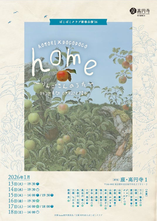 ぽこぽこクラブ主催、新春公演’26 AOMORI×POCOPOCO『home~りんごさんのうた~』が2026年1月13日 (火) ~ 2026年1月18日 (日)に座・高円寺1(東京都 杉並区 高円寺北 2-1-2)にて上演されます。 チケットはカンフェティ(運営:ロングランプランニング株式会社、東京都新宿区、代表取締役:榑松 大剛)にて発売中です。