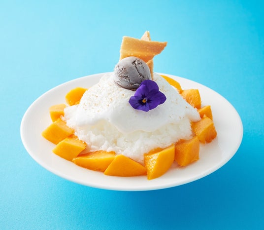 宮崎マンゴーのマンゴープリンと、トッピングした1玉分のフレッシュマンゴーのとろけるような味わいがミルク氷にマッチ。氷の上のココナッツソース、チョコアイスも相性抜群。ローストしたココナッツやクッキーの食感も楽しい一品。