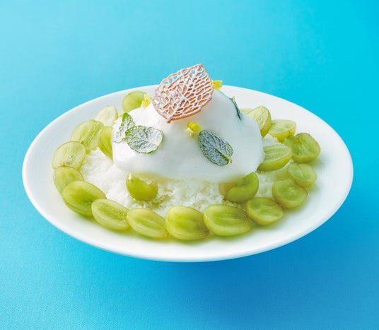 8月後半から最盛期を迎えるシャインマスカットのかき氷が初登場。 爽やかなライムのシャーベットの上にミルク氷を重ね、カルピス(R)のエスプーマをトッピング。10粒以上のシャインマスカットを並べ、リーフ型のシガールを飾って仕上げました。