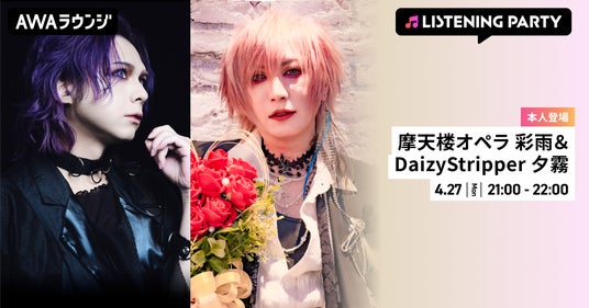 AWA株式会社(本社:東京都港区、代表取締役CEO:冨樫晃己)が運営する、サブスクリプション型(定額制)音楽ストリーミングサービス「AWA(アワ)」は、2026年4月27日(月) 21:00~22:00にて、無料で誰でも参加できるオンライン空間「ラウンジ」で、摩天楼オペラ 彩雨&DaizyStripper 夕霧が音声とチャットで登場するリスニングパーティーを開催いたします。