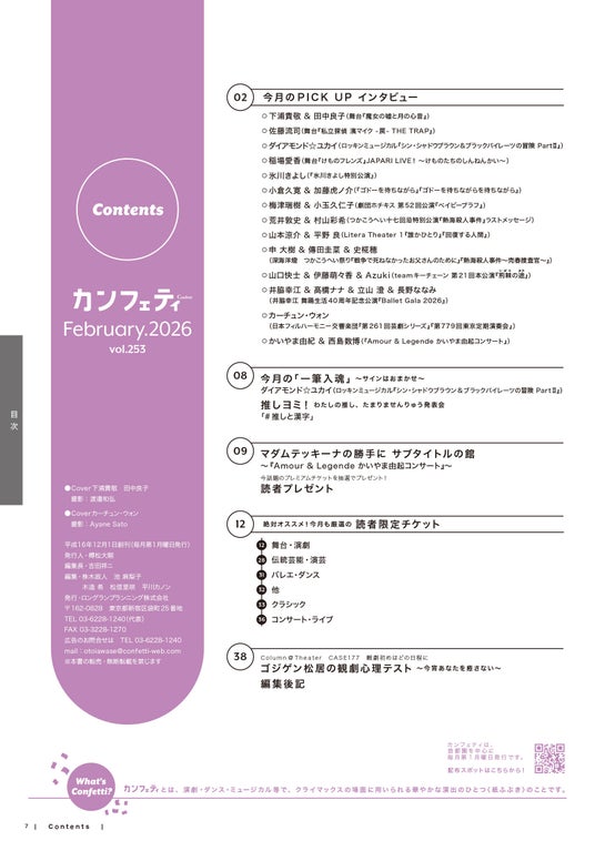 「エンタテインメントを、もっと身近なものに。」を理念とするロングランプランニング株式会社(東京都新宿区、代表:榑松大剛)は、シアター情報誌「カンフェティ」2月号 vol.253 を2026年1月5日(月)に発行いたします。配布場所は、首都圏を中心とした劇場・ショップ・駅など合計1,500箇所以上に設置されます。