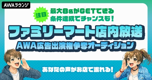 AWA株式会社(本社:東京都港区、代表取締役CEO:冨樫晃己)が運営する、サブスクリプション型(定額制)音楽ストリーミングサービス「AWA(アワ)」は、ファミリーマート店内放送に出演できる権利を懸けたオーディションを開催いたします。
