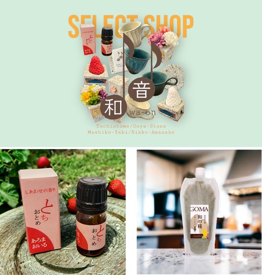 世界でもここにしかない<とちおとめのアロマオイル>や、『飲むスイーツ』と称され、味わうと甘酒の認識が変わる<日光あま酒・和の糀>。日本遺産にも登録された大谷石の特性を活かしたアロマストーンやコースターなどの大谷石製品。そして、おしゃれな益子焼の器たちもそろいました。